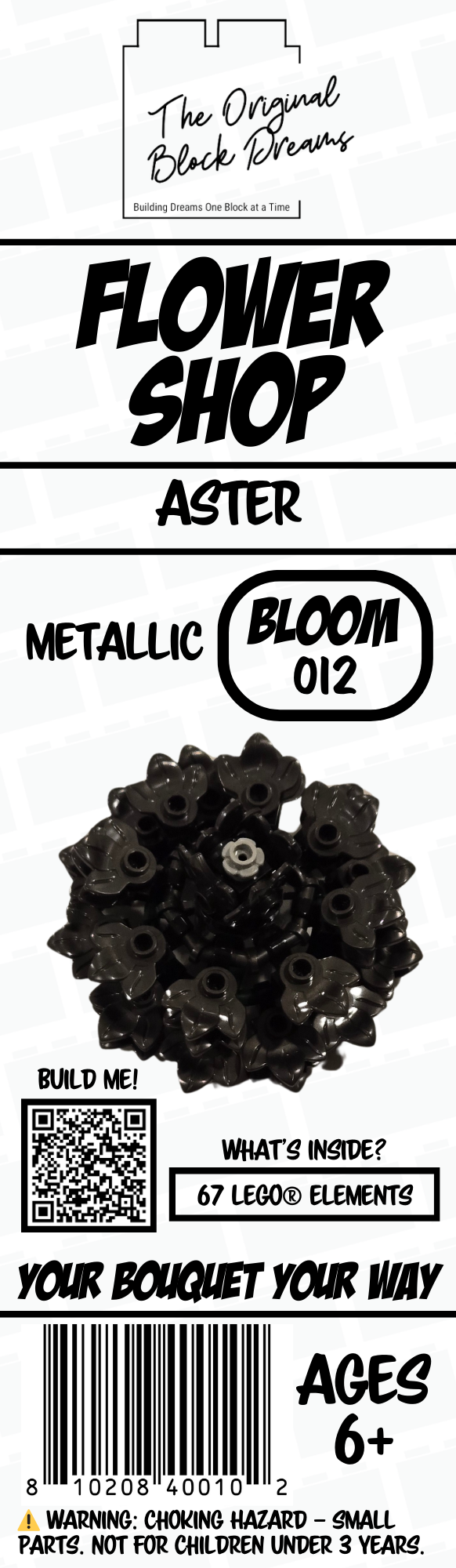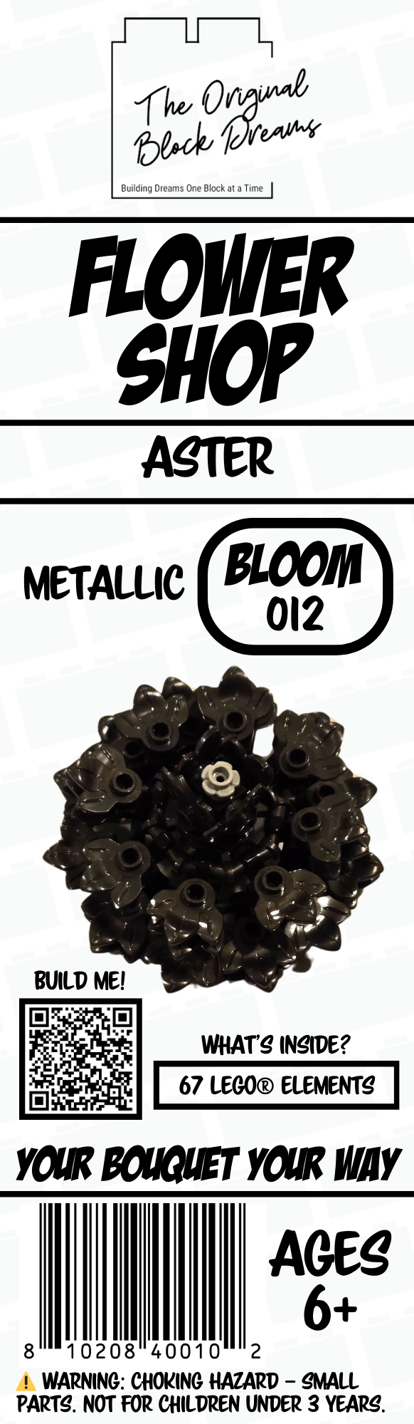Add the Aster (Bloom 012) in Metallic to your custom brick-built bouquet. Mix and match blooms to build your bouquet your way. This product uses genuine LEGO® elements. LEGO® is a trademark of the LEGO Group, which does not sponsor, authorize, or endorse this product.